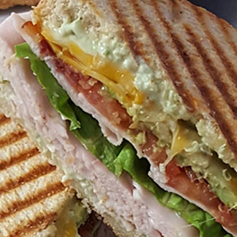 Turkey, Pesto Parmesan Ham, Mozzarella, Onion, Avocado, Tomato, Cracked Pepper, toasted with a light drizzle of EVOO, topped with Lettuce
