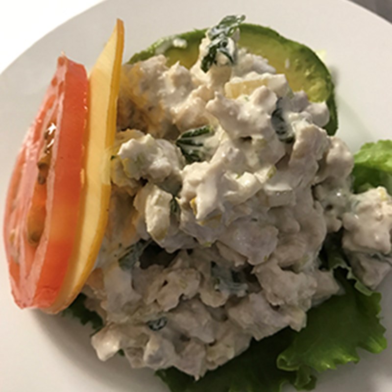 Diced Chicken mixed with our Original Chicken Salad Dressing, served on a bed of Lettuce with Tomato & Crackers. Contains green onion & almond