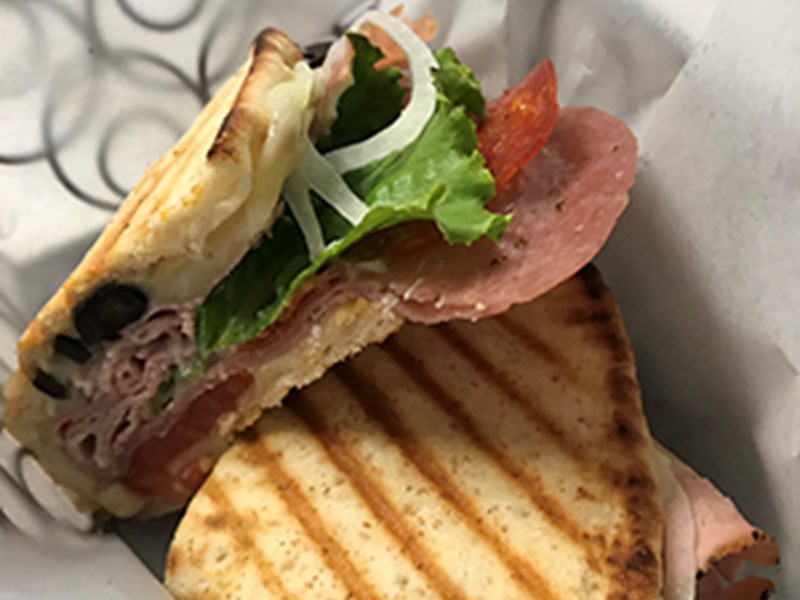 Salami, Pepperoni, Pesto Parmesan Ham, Mozzarella, Onion, Black Olives, Tomato, served on Flatbread, toasted, dressed with Lettuce & Mayo