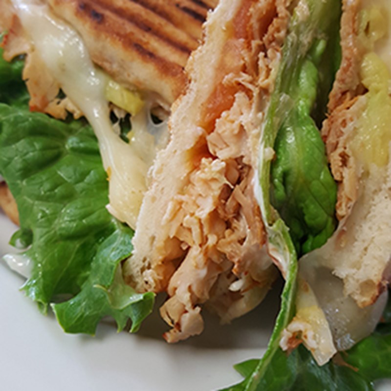 Turkey, Pesto Parmesan Ham, Mozzarella, Onion, Avocado, Tomato, Cracked Pepper, toasted with a light drizzle of EVOO, topped with Lettuce