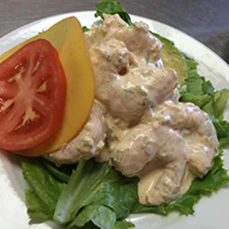 Shrimp tossed in our Spicy Shrimp Salad Dressing. Served on a bed of Lettuce with Tomato & Crackers. Contains green onion